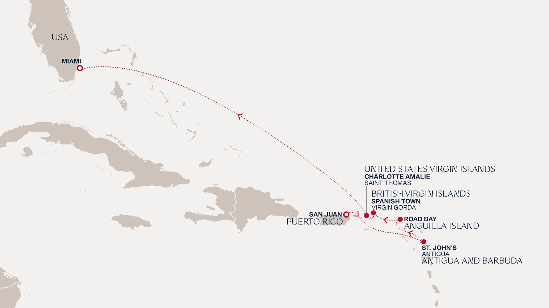 We glide through Caribbean beauty and wonder, where history, rhythm and colour converge. Feel the pulse of San Juan, a tapestry of Spanish legacy and island warmth. Chase the thrill of St. John’s, Antigua, before the tranquil shores of Anguilla invite you to slow the pace. Coast into Virgin Gorda's warm embrace, then savour the eclectic spirit of Charlotte Amalie. With a vibrant blend of Latin zest and iconic art deco, Miami dreams call you to adventure.