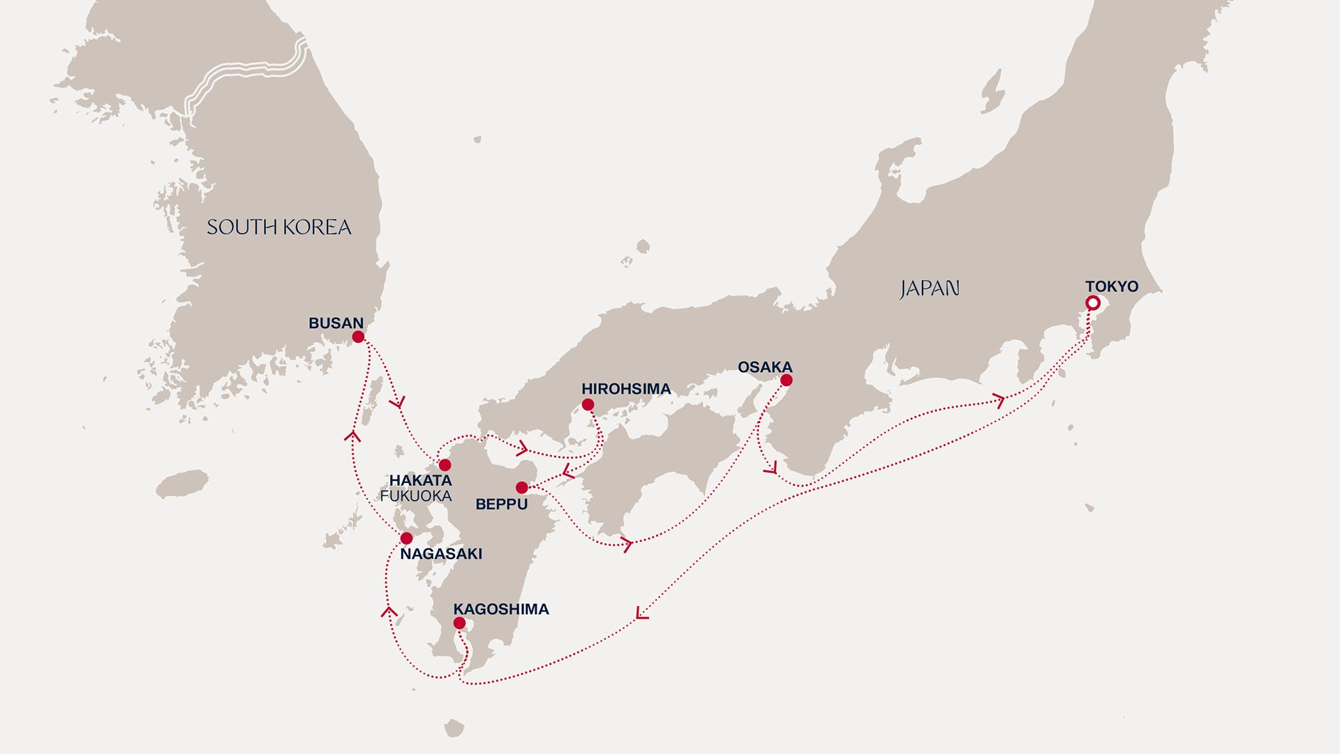 Immerse yourself in a journey through Japan and beyond, where tradition meets vibrant modernity. From Tokyo’s dazzling streets, sail to Kagoshima’s volcanic landscapes and Nagasaki’s historic harbours. Explore Busan’s coastal charm and Hakata’s rich culture, then reflect in Hiroshima’s serene gardens. Discover Beppu’s steaming hot springs and Osaka’s culinary delights before returning to the timeless pulse of Tokyo.