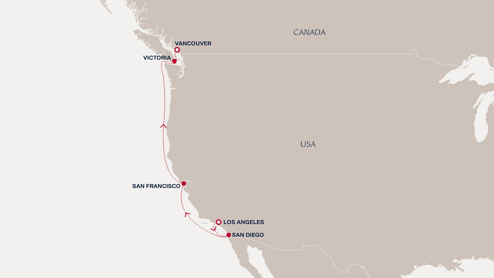 Set sail from star-studded Los Angeles to the chic beachside idylls and seafaring legacy of San Diego. Between memorable days at sea, savouring unmatched serenity aboard EXPLORA III, revel in cosmopolitan San Francisco, where world-class cuisine, iconic bridges and historic streets await. We drift north to Victoria’s blend of British elegance and rugged coastal allure before our journey concludes with Vancouver’s striking skyline, framed by spectacular mountains and lakes.