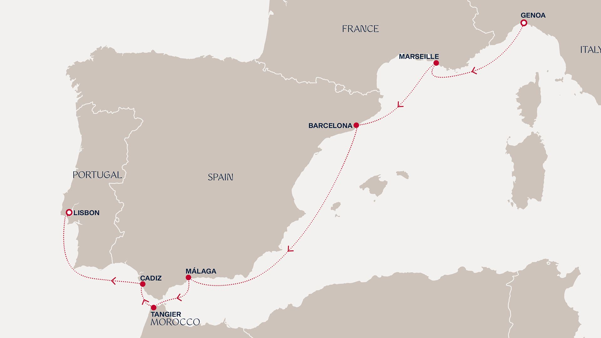 From the historic charm of Genoa we sail to Marseille’s bustling streets and sunlit terraces. In Barcelona, Gaudí’s bold visions mix with lively boulevards and tasty tapas. A relaxing day at sea glimmers with endless Mediterranean blue as we drift to Malaga’s Moorish palaces and palm-fringed beaches. Tangier welcomes us with spice-laden souks and whitewashed lanes, and Cadiz offers golden sands and architectural marvels, before our journey draws to a close against the backdrop of Lisbon’s hills.